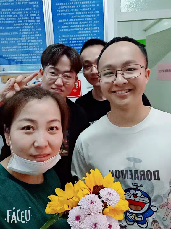 今年毕业派遣的时候拍的,我当时在值班室,三位住在1楼的男生们进来了,送我一束花。平常这几位同学都很暖心的,每次给我打招呼都笑嘻嘻的,他们和我关系一直很好。他们毕业了要去别的学校读博了,当时我眼泪差点掉下来。