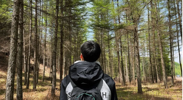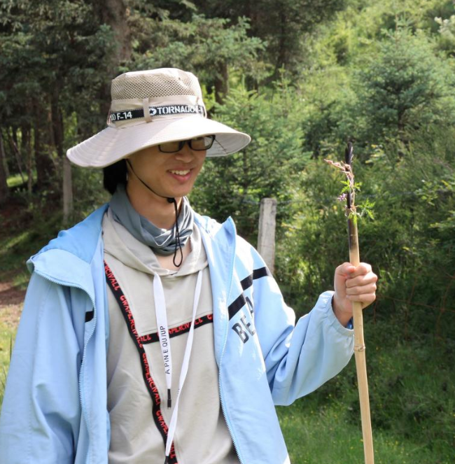 这张照片拍摄于暑假野外实习时。因为疫情我们没法正常回家,于是老师们就带着我们去爬山,一路上一边聊天一边教学。我还在路边捡了一根木棍,把采到的花卉和羽毛插进棍子里,这一幕被同学拍了下来。相信这是很多兰大人野外实习的共同记忆吧!