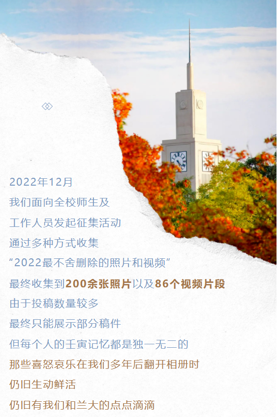 2022年的照片有很多,但我留下了这一张,因为这是我与兰大的初识,一切的故事都从这里启航。经历一千多公里的远赴,亲眼见证一路山水的变换,对兰大的幻想呼之欲出。初入校园的那日,蓝天白云,骄阳正好,有风吹过林梢,听见它说,笑一个吧,定格这个瞬间。