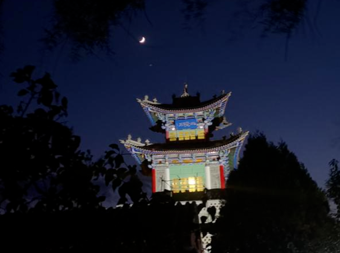 照片拍摄于2022年7月3日的兰山,期末考试结束后室友们一起去玩时所拍。那时兰州没有疫情,出去玩甚至可以不用带口罩,我们从下午五点等到晚上九点看兰州夜景。回去时看到新月当空,微风吹动,树影婆娑,上面平铺皓影,三台阁流转着光银,十分令人触动。我将永远怀念2022年短暂没有疫情的兰州夏天。