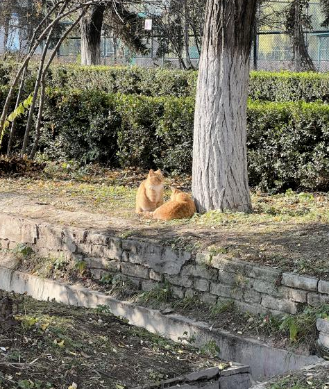 我走在去东区田径场的路上,只是一回头,就看见两只在树下沐浴阳光的小猫,我瞬间想到了“岁月静好”。阳光倾泻下来,洒在它们身上,没有人去打搅它们,我感觉它们好舒服、好快乐。我不禁拿起手机,定格下这温暖的一幕。你知道这两只猫咪叫什么名字吗?