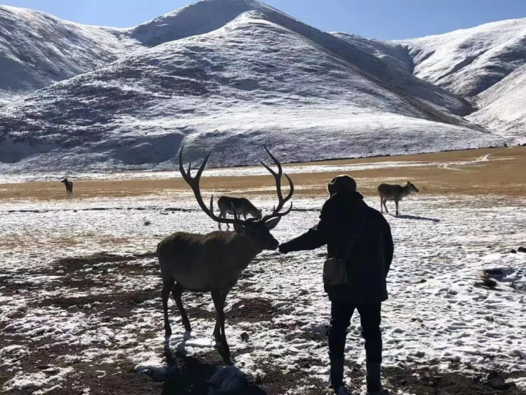 这是今年青藏高原考察的照片,我在海拔4400米的青藏高原上,有幸遇见我的好朋友国家二级重点保护野生动物——马鹿。生态文明的标尺在于人与动物之间的距离。