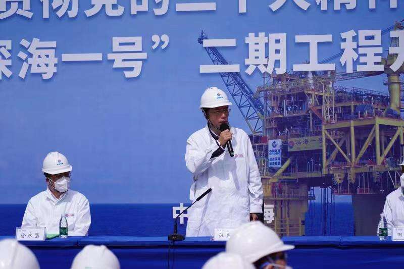在“深海一号”能源站上,党的二十大代表、中国海油党组书记、董事长汪东进主持开工并向一线干部员工宣讲党的二十大精神。他说,“深海一号”二期工程是中国海油贯彻落实党的二十大精神,加大油气资源勘探开发和增储上产力度,加快实现高水平科技自立自强的新举措、新作为。该项目将进一步推动南海万亿方大气区建设,为粤港澳大湾区和海南自贸港“双碳”转型贡献更大力量,投产后可使中国海油在该区域的清洁天然气供应量超过180亿立方米/年。“深海一号”二期的开发还将突破一系列技术难题,使我国成为世界上极少数能自主开发深水高温高压气田的国家之一。