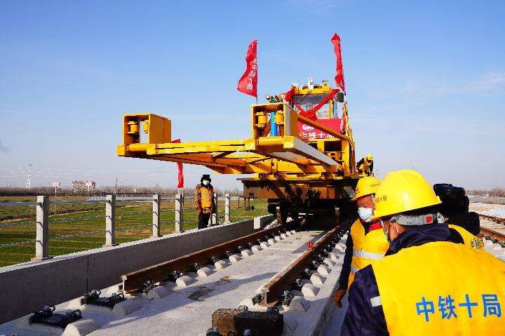 12月15日,在济郑高铁山东聊城段,中铁十局的工作人员在进行铺轨作业。当日,济(南)郑(州)高铁(山东段)铺轨开工仪式在聊城举行,随着第一对长500米的钢轨缓缓入槽,标志着济郑高铁(山东段)开启全面铺轨建设。新华社记者 郭绪雷 摄