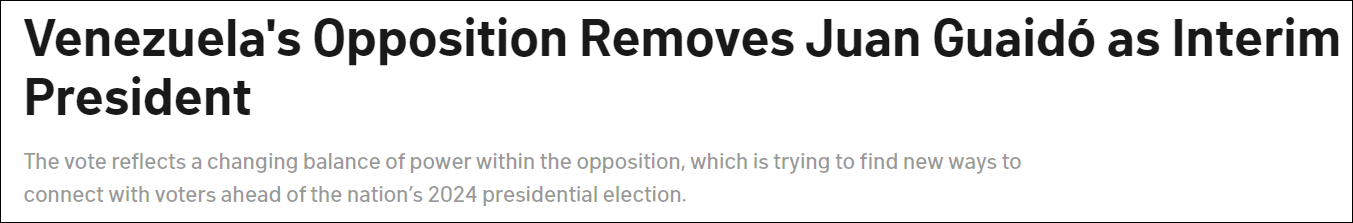 委内瑞拉暂定于2024年举行总统大选,该国反对派寻求在此之前建立“统一战线”并提高支持率。而此前,瓜伊多失去了对议会的控制,且来自欧盟和拉美地区的支持也在减弱。