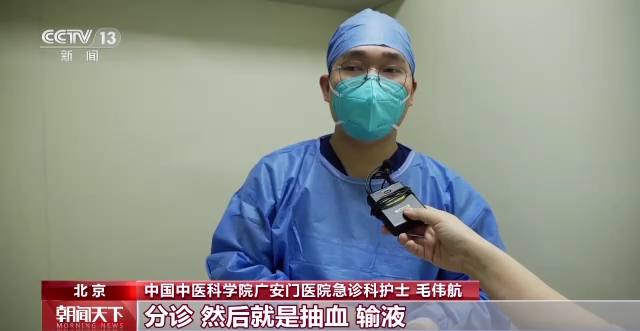 中国中医科学院广安门医院急诊科护士 毛伟航:分诊,然后抽血、输液,如果是120来了,需要抢救病人,这些基本上都需要会。还是比较热爱这个工作,来了之后跟病人服务觉得还是挺有成就感的。