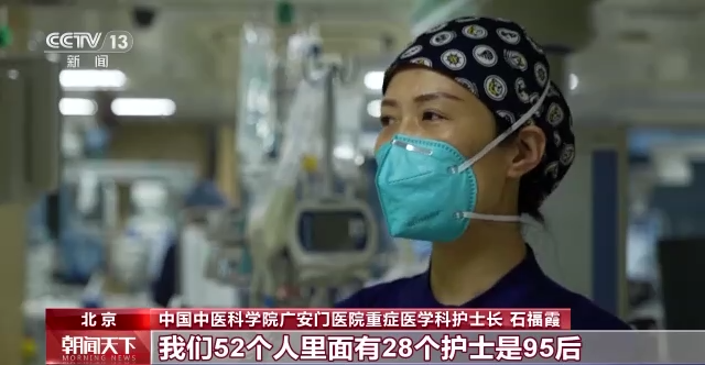 中国中医科学院广安门医院重症医学科护士长 石福霞:我们52个人里面有28个护士是95后,其中又有8个护士是00后,我们最年轻的护士是01年。她们在家里是父母的宝贝,在单位是我的宝贝。