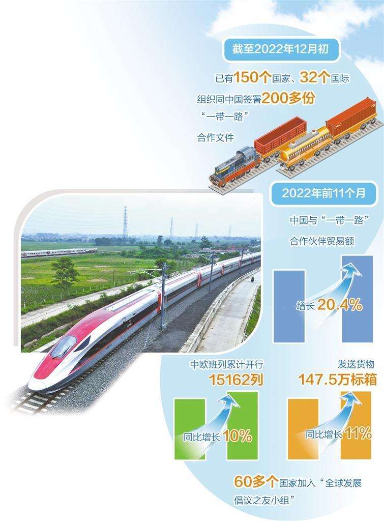 “一带一路”倡议取得实打实、沉甸甸的成绩,是中国方案深入人心、广受认可的有力证明。得益于“一带一路”倡议,东非、柬埔寨有了高速公路,哈萨克斯坦有了出海口,马尔代夫有了跨海大桥,老挝由“陆锁国”变成“陆连国”,尤其面对疫情冲击,“一带一路”合作不但没有按下“暂停键”,反而展现出强大韧性和活力。2022年前11个月,中国与“一带一路”合作伙伴贸易额逆势增长20.4%,中欧班列累计开行15162列、发送货物147.5万标箱,同比分别增长10%、11%,展现出强劲韧性。中老铁路、克罗地亚佩列沙茨大桥建成通车,匈塞铁路、中泰铁路等重点项目稳步推进。