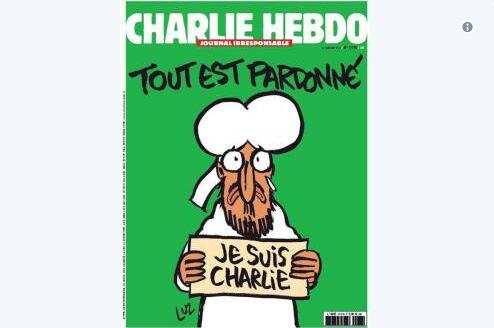 在巴黎恐袭过后,《查理周刊》又在首页刊登了一副漫画,其中画着的一名先知手拿“一切都可被原谅”的标语。