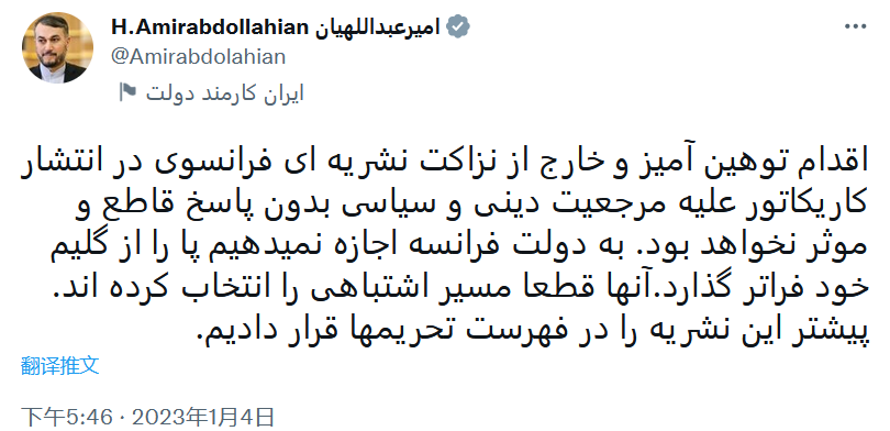 此举引发伊朗方面的怒火。隔天(4日),伊朗外交部长侯赛因·阿米尔-阿卜杜拉希安(Hossein Amir-Abdollahian)在推特上开轰:“如果没有果断和有效的回应,法国出版物对宗教和政治权威的侮辱和不雅行为将不会得到解决。我们不会允许法国政府越界,他们肯定选择了错误的道路。”