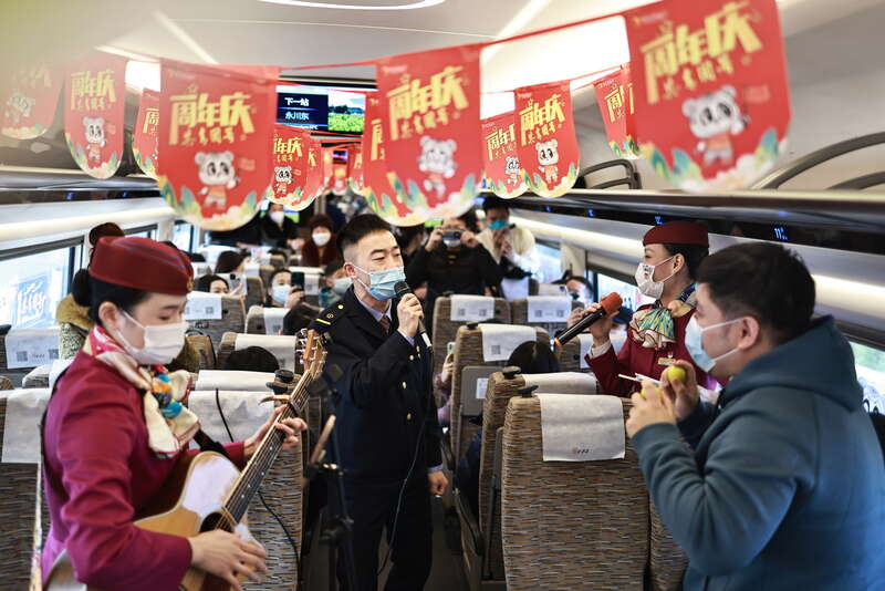 在由重庆北开往成都东的G8612次列车上,列车乘务员、动车机械师、机车乘务员为旅客们带来了歌曲、舞蹈等才艺展示,还通过小游戏与旅客互动。