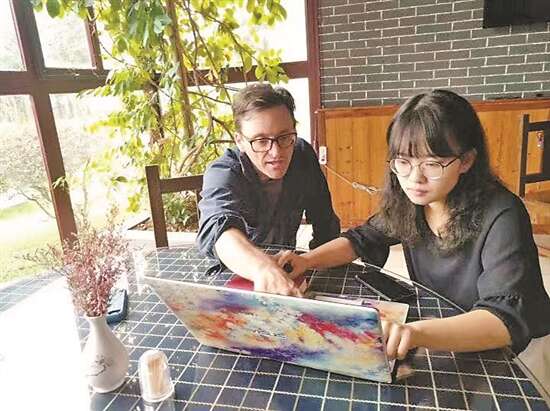 2019中山大学作家写作营中,美国作家Geoffrey和学生在讨论作品翻译问题