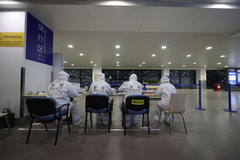 1月7日22时许,上海闵行公安浦东国际机场防疫专班结束相关工作,专班接收C组护送组组长彭超在安排最后一班航班的旅客护送离开后,与其余的组员开始整理装备撤离摊位。