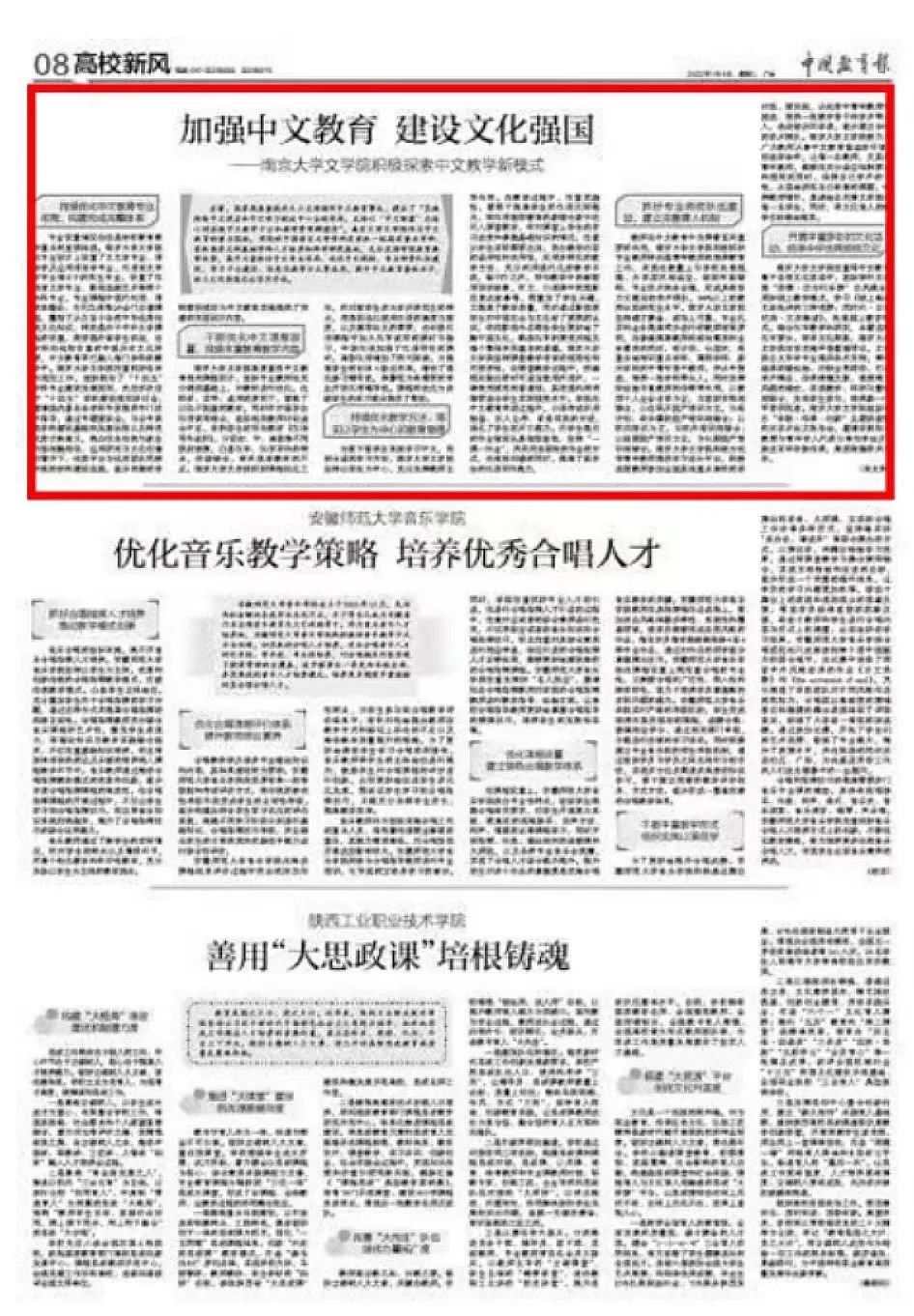 近日,《中国教育报》刊登题为《加强中文教育 建设文化强国——南京大学文学院积极探索中文教学新模式》的文章,报道了南京大学文学院充分发挥教育教学优势,集中力量抓好中文专业布局、优化中文课程、专业师资队伍建设、学习平台建设、信息化教学方式等运用,提升中文教育整体水平,助力文化强国迈出坚实步伐的重要举措。全文内容如下: