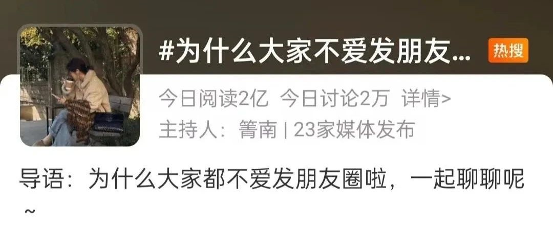 最近,“为什么大家都不爱发朋友圈了”这个话题再一次冲上了微博热搜,许多网友都在下面吐槽说本来想发个朋友圈,但每次发送之前文案照片都需要仔细斟酌,还要设置不同的分组,害怕会让别人产生不必要的误会……