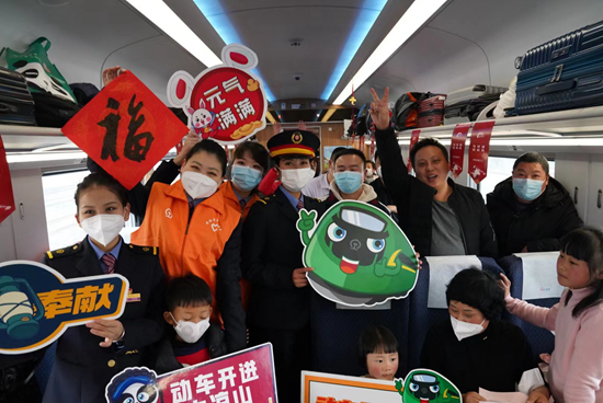 1月7日,春运首日。成都南开往攀枝花南的C43次列车长阿衣布卡和旅客互动迎接新成昆铁路的首个春运。范东海/摄