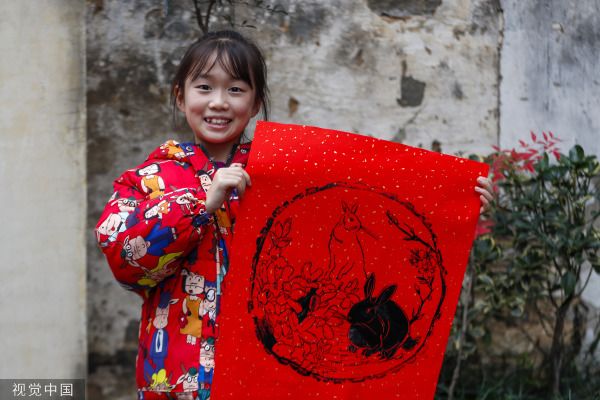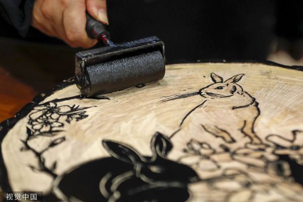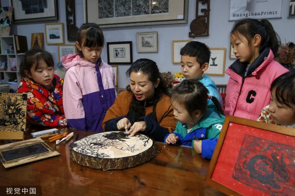 2023年1月12日,安徽黄山,徽派版画非遗传承人薛寅在指导孩子们雕刻版画母版。近日,在安徽省黄山市屯溪区徽派版画艺术馆里,非遗传承人薛寅将活泼可爱的萌兔融入徽派版画中,栩栩如生,深受孩子们的喜爱,妙趣迎新春。
