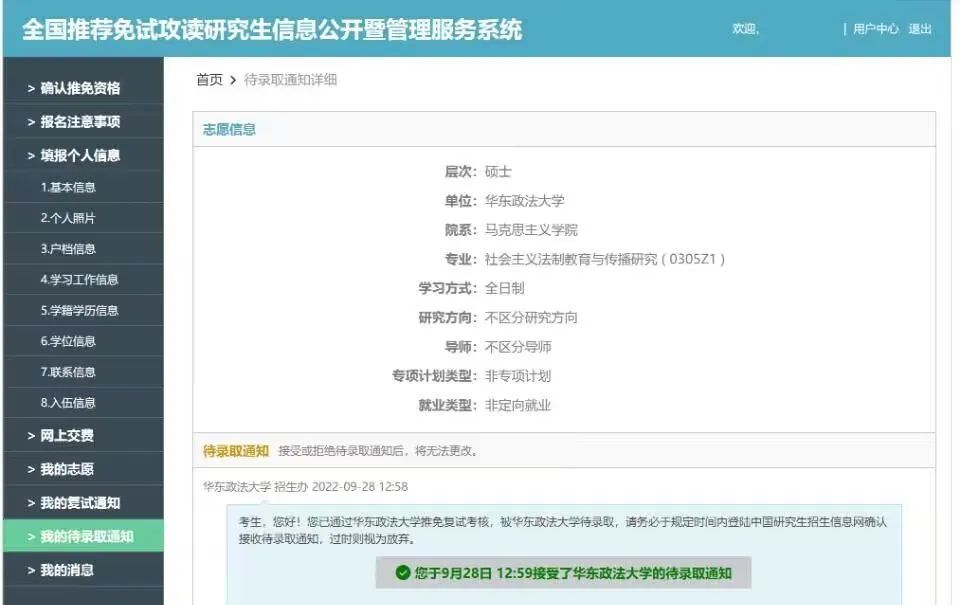 2022年9月28日12时59分,陈聪收到了华东政法大学的待录取通知。从济南到上海,飞机不过一个半小时的时间,而从山师到华政,陈聪却用了近四年时间“野蛮”生长,才拿下敲门砖。回想当年的稚嫩与经年的成长,陈聪心中感慨万千。
