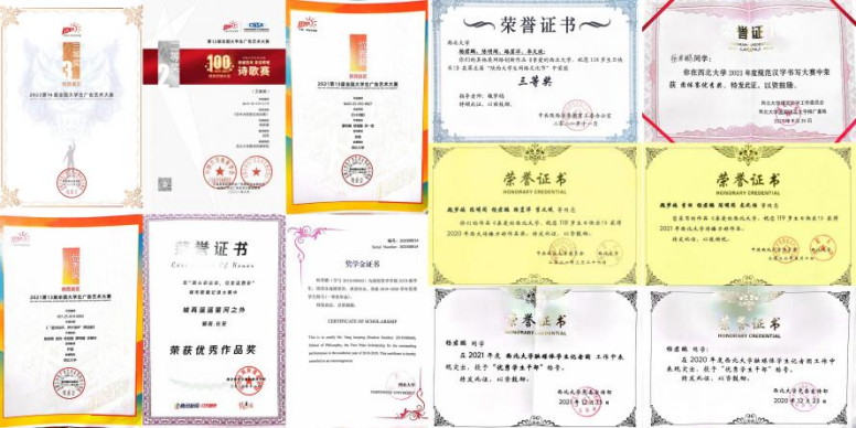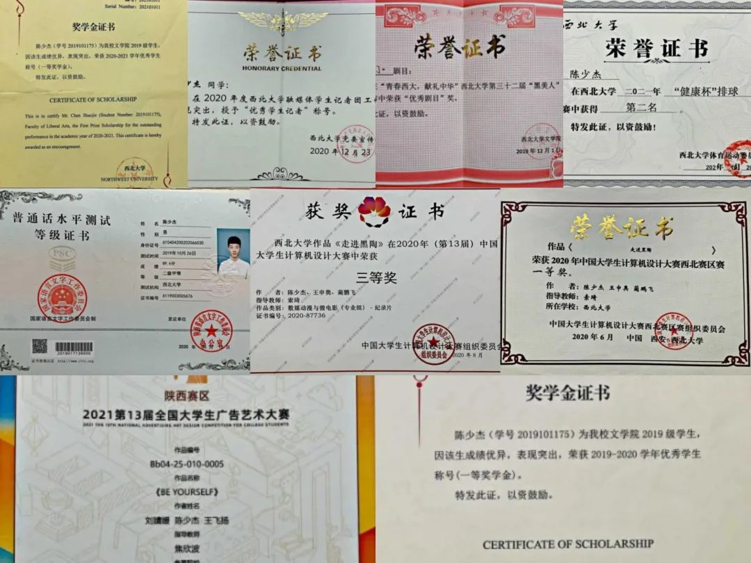 曾获中国大学生计算机设计大赛三等奖,大广赛陕西赛区三等奖,西北大学第32届“黑美人”艺术节优秀剧目奖。专业排名第一,获校一等奖学金。