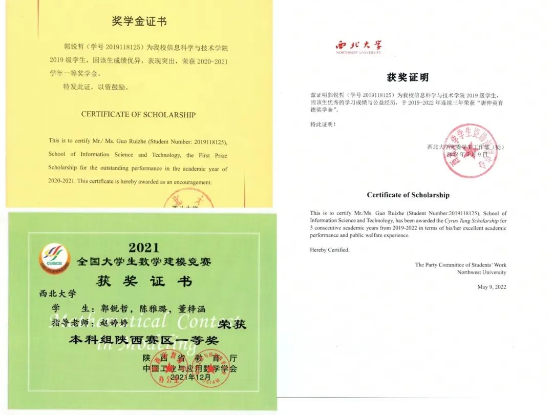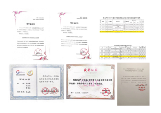 连续三年获校一等奖学金,综合成绩排名第一,曾获高教社杯全国大学生数学建模竞赛全国一等奖,西北大学数学建模竞赛获一等奖,第十二届全国大学生数学竞赛(非数学类)三等奖。主持国家级大创项目并顺利结题。