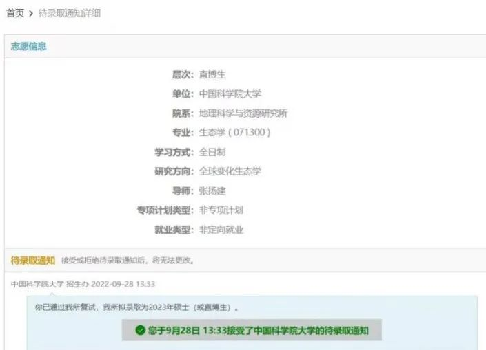 保送至中国科学院大学生态学专业