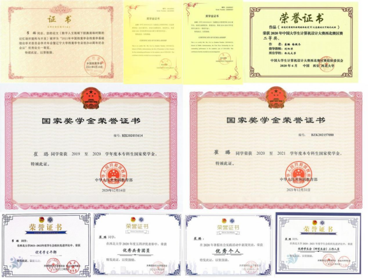 连续三年获国家奖学金、曾获全国大学生英语竞赛二等奖、中国大学生计算机设计大赛西北地区赛二等奖、2021年中国档案学会档案学基础理论学术委员会学术年会优秀论文一等奖,参与撰写并发表中文核心期刊2篇,西北大学“优秀学生标兵”称号。