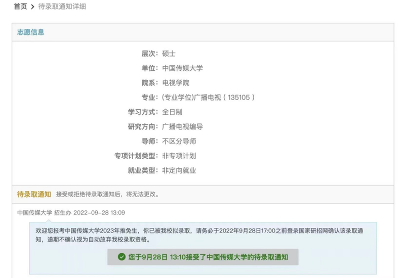 保送至中国传媒大学广播电视专业