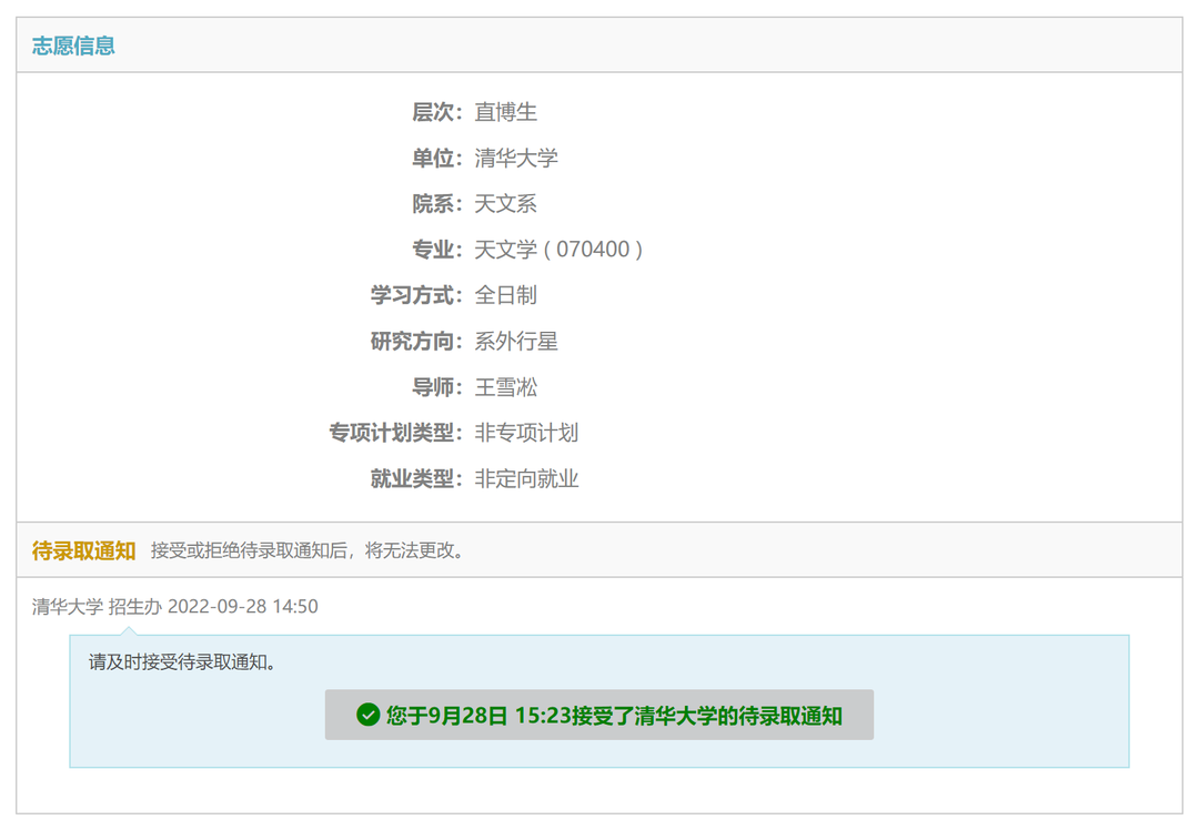 保送至清华大学天文学专业(直博)