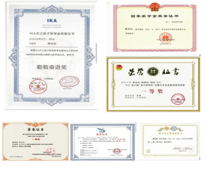 曾获两次国家奖学金,三次校一等奖学金,化学菁英奖一等奖学金,全国大学生化学实验创新设计大赛西北赛区一等奖,“互联网+”省级银奖,“东方财富杯”金融挑战赛国家级一等奖,西北大学优秀学生标兵。