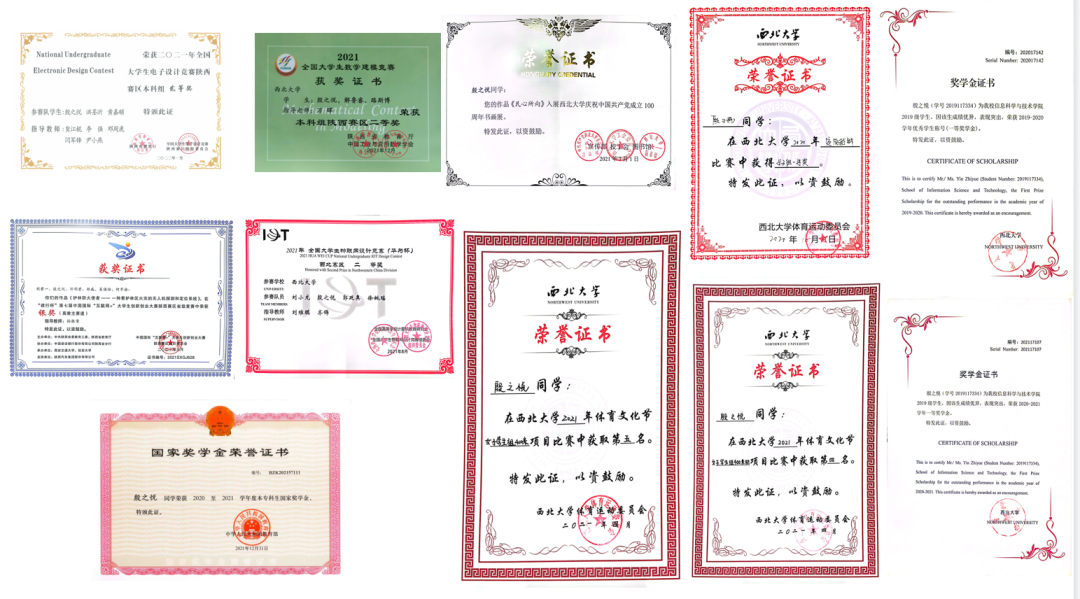 曾获国家奖学金,连续三年获校一等奖学金,互联网+陕西省银奖,全国大学生数学建模竞赛陕西省二等奖两次,全国大学生电子设计竞赛陕西省二等奖,全国大学生物联网设计大赛西北赛区二等奖,西北大学环道越野赛第一名、400米栏第四名、400米第五名。