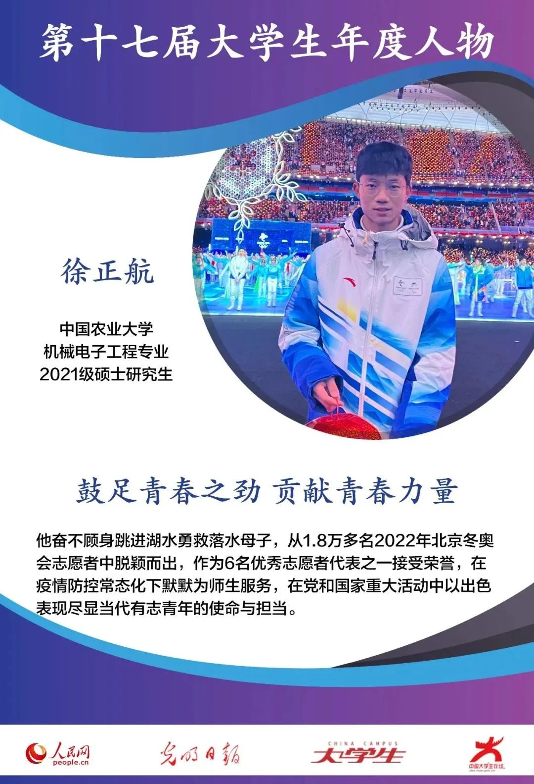 近日,在教育部、人民日报社共同指导,人民网、光明日报社教育部、《大学生》杂志和中国大学生在线联合主办的第十七届“大学生年度人物”推选展示活动中,中国农业大学工学院学生徐正航获评第十七届“大学生年度人物”。