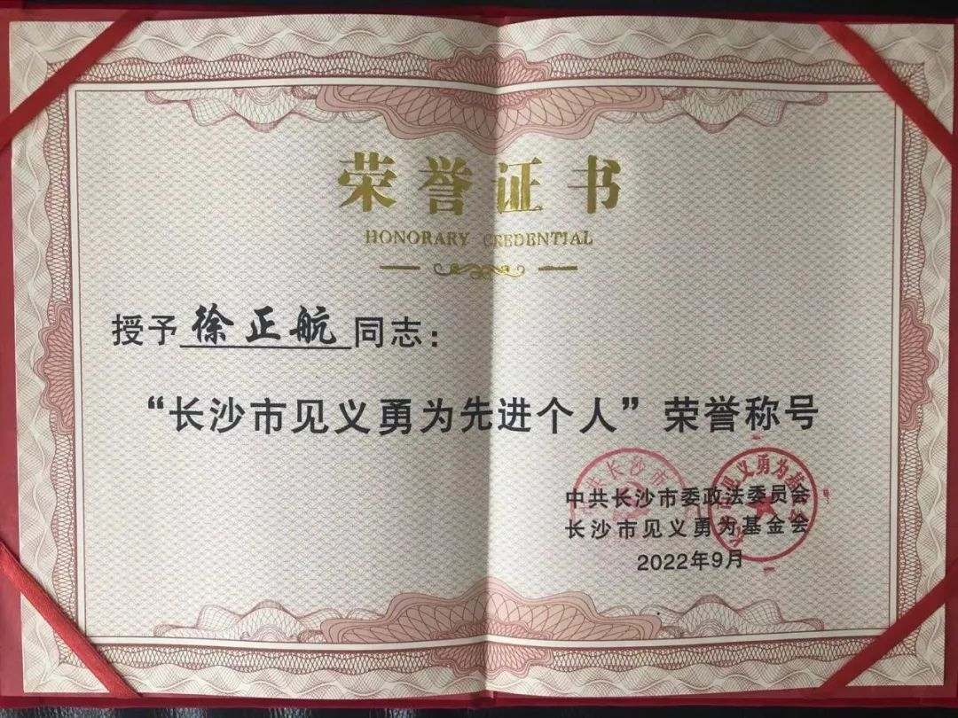 2021年国庆假期,徐正航与好友前往湖南省浏阳市某旅游度假区度假。在景区的湖岸,突遇一名6岁儿童不慎落水,儿童母亲同时扑入水中营救,但母子二人因不会游泳陷入险境。徐正航见此情景,快速奔向落水母子,奋不顾身跳入水中。湖水深不可测,母亲抱着孩子出于求生本能,像是抓住了救命稻草般用力支撑着徐正航,场面极度危险。此时,徐正航在自身安全受到威胁的危急情況下,依然拼尽全力,坚定地将母子二人往岸上托举,减少二人溺水可能。最终,母子二人得以脱险。