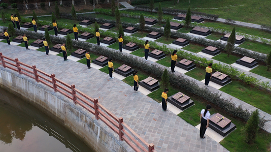 广东省韶关市红军长征粤北纪念馆讲解员谭慧娴带领小学生为革命先烈敬献鲜花。