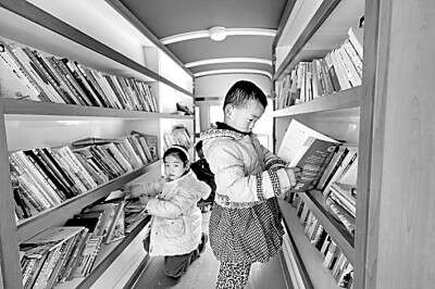 在江西省庐山市图书馆的爱心图书车上,小朋友们挑选自己喜爱的读物。韩俊烜摄/光明图片