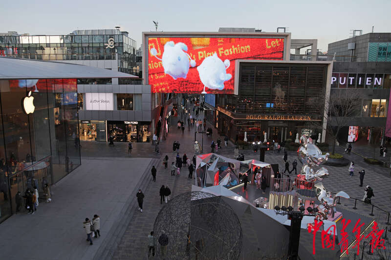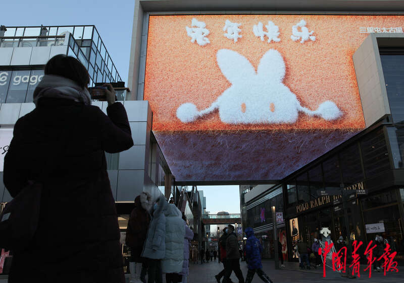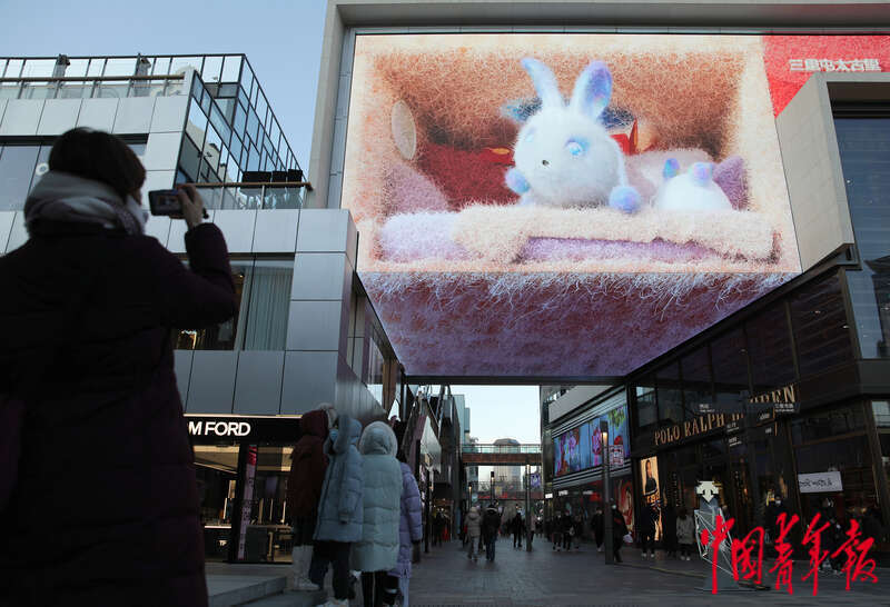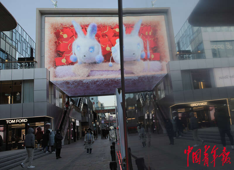 1月19日,北京三里屯一处户外大屏,屏幕里播放着绒毛兔大拜年的裸眼3D图像。中青报·中青网记者 陈剑/摄