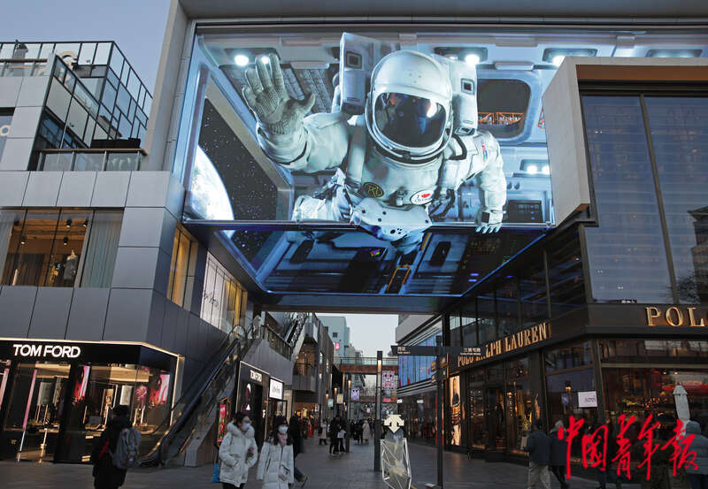 1月19日,北京三里屯一处户外裸眼3D大屏里,航天员正在向人们招手致意。中青报·中青网记者 陈剑/摄