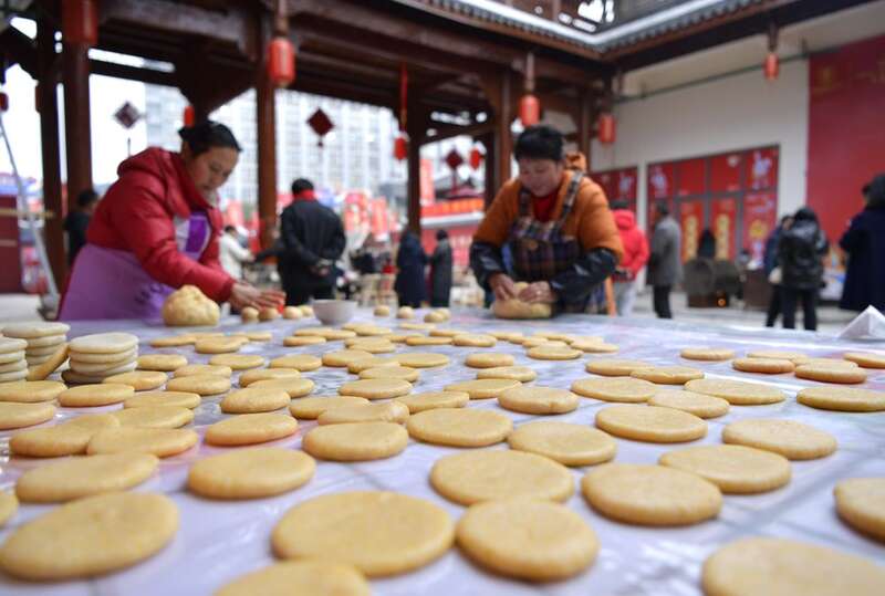 ↑1月18日,在湖北省宣恩县举行的乡贤大会上,人们制作当地传统美食糍粑。新华社发(宋文 摄)