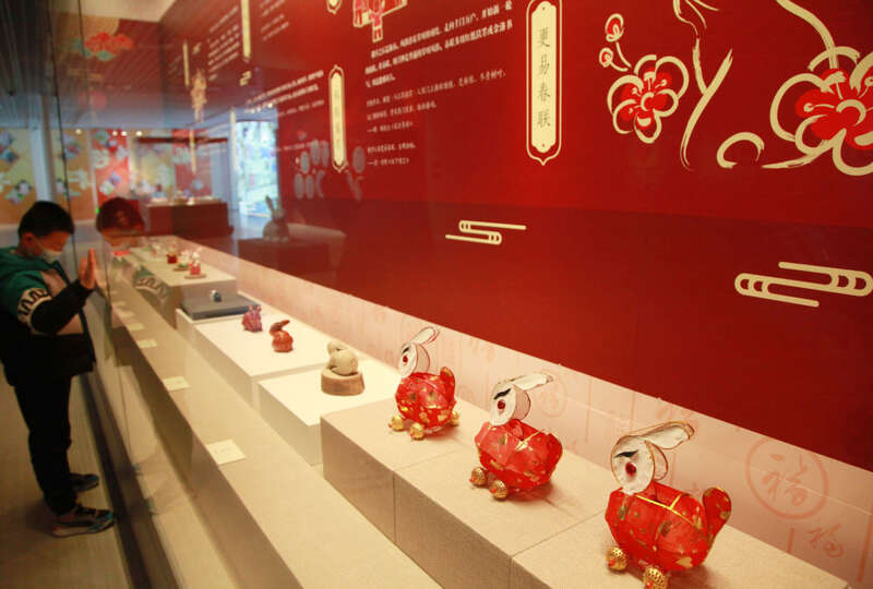 ↑1月19日,观众在江苏省南京市六朝博物馆参观“我们的节日·福兔迎春——癸卯年贺岁展”。新华社发(刘建华 摄)
