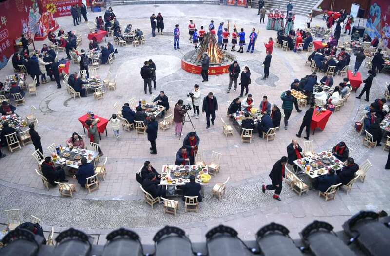 ↑1月18日,在湖北省宣恩县举行的乡贤大会上,人们在参加“刨汤”宴。新华社发(宋文 摄)