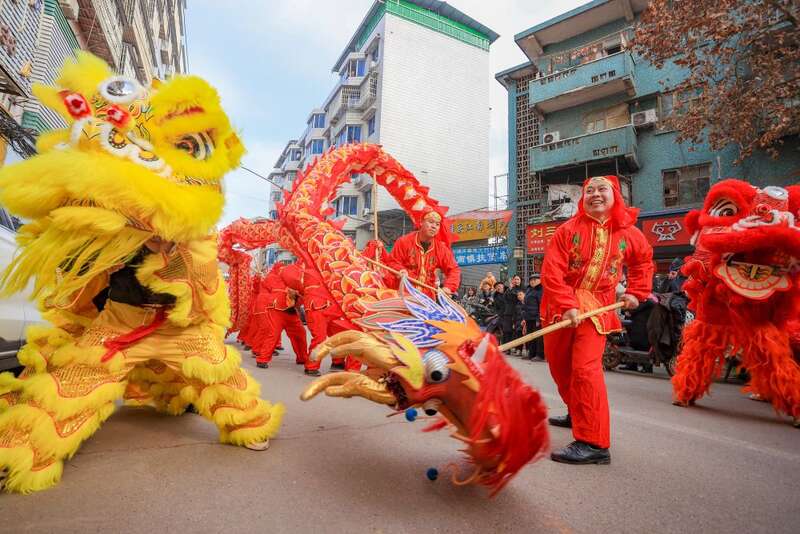 ↑1月19日,民间艺人在四川省遂宁市蓬溪县蓬南镇街头表演舞龙、舞狮。新华社发(刘昌松 摄)