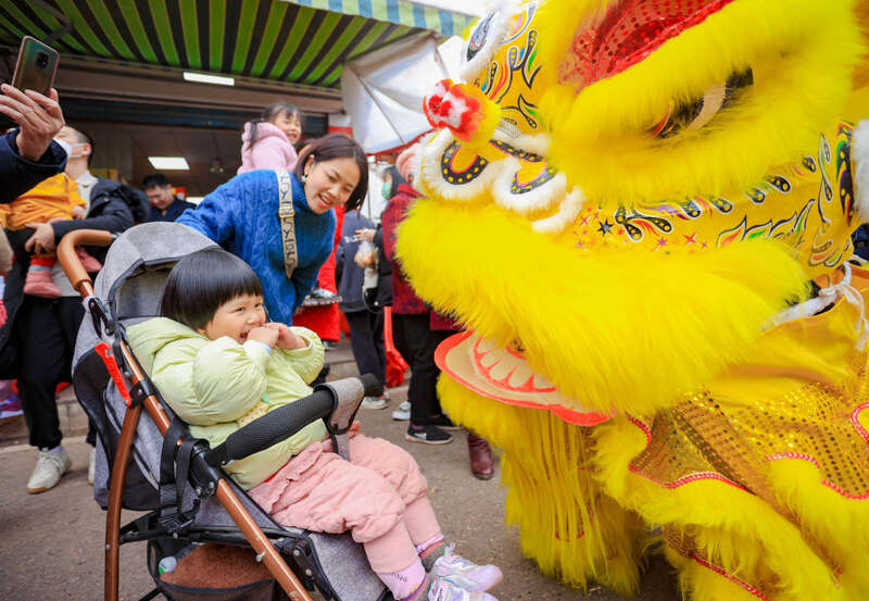 ↑1月19日,在四川省遂宁市蓬溪县蓬南镇街头,舞狮表演者与小朋友互动。新华社发(刘昌松 摄)
