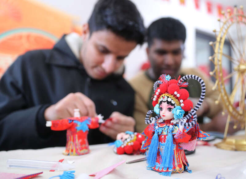 ↑1月19日,山东科技大学的留学生在制作绢人工艺品。新华社发(张进刚 摄)