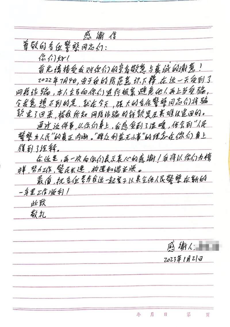 资金追回后,民警第一时间联系麻某,他领回了被骗资金,看到钱失而复得,麻某激动不已,特地写了一封感谢信送到峙浪边境派出所,感谢民警尽职尽责。