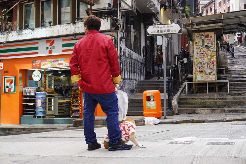 1月22日,香港中西区威灵顿街,一位身着唐装的男子带着宠物狗站在路旁,新年装扮成为街头一景。