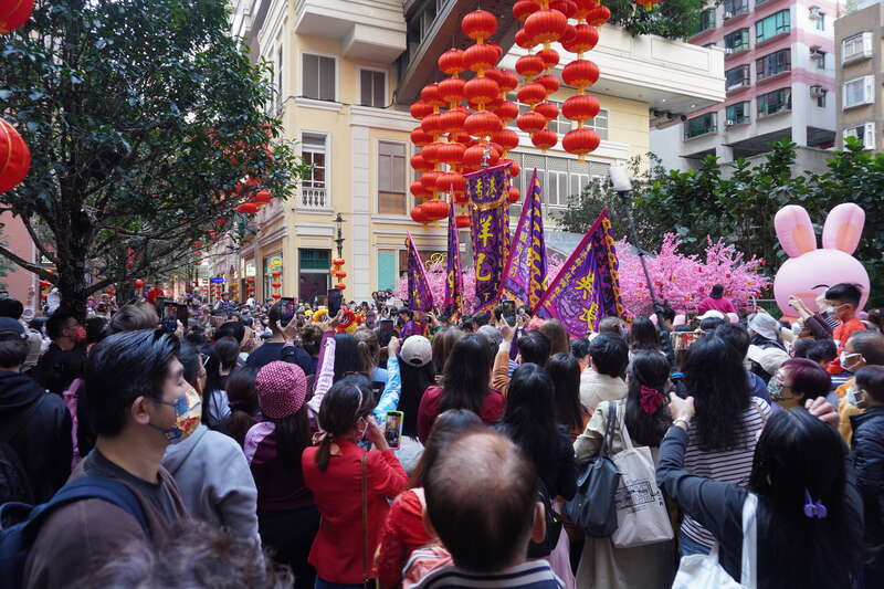 1月22日,香港湾仔区利东街,传统舞龙舞狮表演吸引人们驻足观看。舞狮活动在香港历史悠久,已被纳入香港非物质文化遗产清单。
