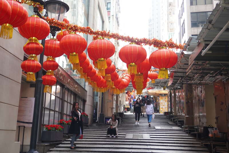 1月22日,香港中环石板街,高高悬挂的红灯笼下,人们自拍留影。