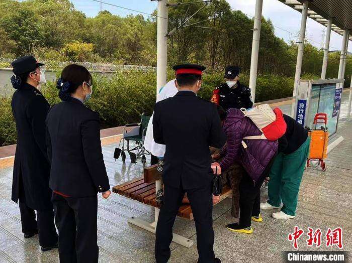 14时30分,120医护人员赶到站台,现场民警、车站工作人员一同将患病旅客抬上轮椅,并全程护送其上救护车。最终,救护车将疾病旅客转运至前海人寿韶关医院进行救治。