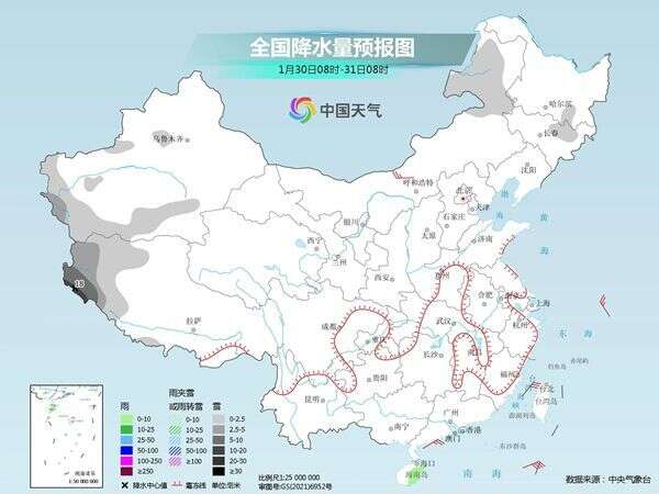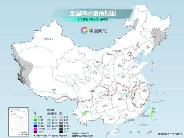 具体来看,今天内蒙古东北部、黑龙江东南部、吉林东部、新疆南疆西部山区、西藏西部等地部分地区有小到中雪,其中,西藏西南部等地部分地区有大到暴雪。云南中部、台湾岛大部等地部分地区有小雨。