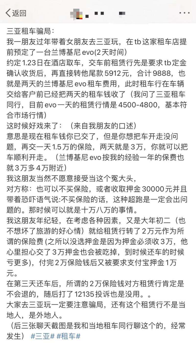 近日,有网友发帖称,其朋友过年去海南三亚玩,提前在租车店预订了一台兰博基尼,在支付了9888元的租车费用后,又被告知想开走车需要缴纳3万元保险。帖子中表示,租车店方面称,“不买保险的话,这种超跑是一定会出问题的,那时候就是十万八万的事情。”