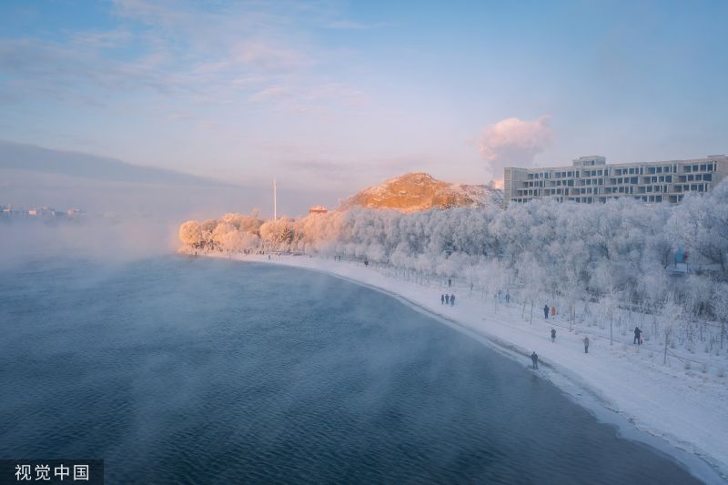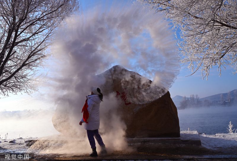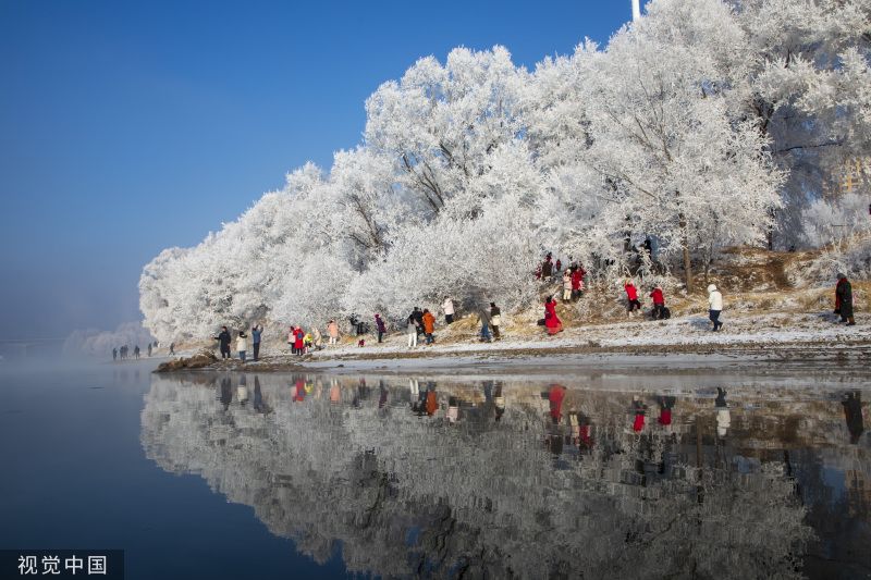 2023年1月30日,吉林,游客在松花江畔爬冰卧雪与雾凇合影。当日吉林市再现雾凇景观,松花江大雾弥漫,玉树琼花。低于零度的水汽和雾滴遇到同样低于冻结温度的物体,如电线、树枝等,迅速凝结成冰晶。新的雾滴一层叠一层附在原来的冰晶上,远看像细小洁白的花朵簇拥在枝头,这便是雾凇。